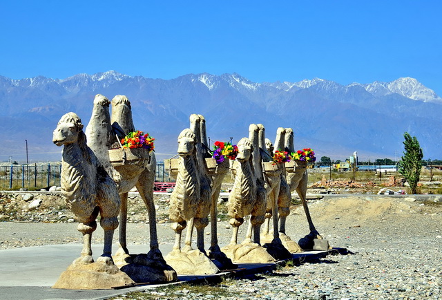 豎立在中哈霍爾果斯國際邊境合作中心哈方區(qū)域的駱駝雕像。攝影/章軻
