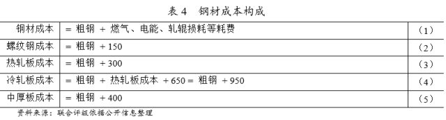 煉鋼環(huán)節(jié)所生產(chǎn)的粗鋼最終用于鋼材的軋制流程;因此,軋鋼過程成本主要由粗鋼構(gòu)成。不同類型鋼材的軋制過程還需不同燃?xì)?、電能、軋輥損耗等耗費;其中,螺紋鋼軋制費用約為150元/噸、熱軋板軋制費用約為300元/噸、冷軋板軋制費用約為950元/噸(冷軋流程軋制費用約為650元/噸,其前序熱軋流程軋制費用約為300元/噸)、中厚板軋制費用約為400元/噸。