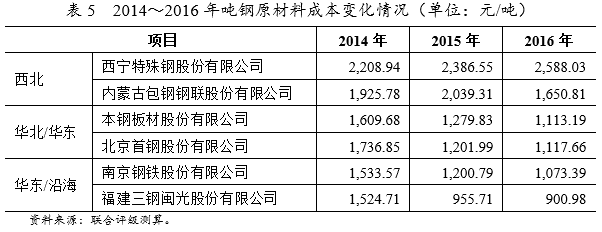 需要說明的是,在表2、表3和表4中,對鋼材成本的測算只抓住了影響鋼材成本的核心變量;因此,測算出各類鋼材成本變動呈現(xiàn)高度的一致性。通過對圖2的觀察以及上文分析,可以得到如下有意義的結(jié)論:鋼材價格決定了鋼鐵企業(yè)在行業(yè)景氣度上行時是否盈利,而鋼材成本決定了鋼鐵企業(yè)在行業(yè)景氣度下行時是否虧損;行業(yè)景氣度上行階段,各家鋼鐵企業(yè)主要信用風(fēng)險均被利潤掩蓋;而行業(yè)景氣度下行階段,企業(yè)運營中不變的成本才是決定鋼鐵企業(yè)信用質(zhì)量的核心。因此,剔除鋼鐵行業(yè)周期性波動以探討鋼鐵企業(yè)信用風(fēng)險的核心就落在了噸鋼成本上。 三 噸鋼制造成本核算及展望 綜合來看,原材料成本、燃料成本、折舊成本和人工及其他成本占噸鋼制造成本的比重大致為67%、16%、4%和13%。2014~2016年,鐵礦石、煤炭、焦炭等上游與原燃料價格波動較大,受供給側(cè)改革影響,走勢出現(xiàn)分化;主要表現(xiàn)為,原材料成本占噸鋼制造成本比重下滑,燃料成本和人工及其他成本占噸鋼制造成本比重上升。