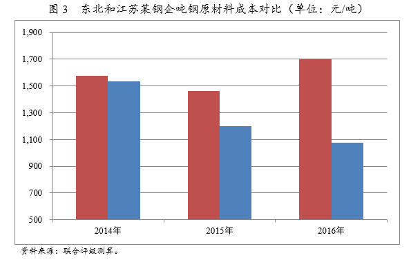自有礦山對鋼鐵企業(yè)原材料供應(yīng)的穩(wěn)定性保障,但在國際鐵礦石價格持續(xù)下滑的整體背景下,國內(nèi)礦山成本劣勢過大對鋼鐵企業(yè)價格競爭力形成較大拖累。以東北某鋼鐵企業(yè)和江蘇某鋼鐵企業(yè)為例:2014年,具備自有礦山的東北某鋼鐵企業(yè)和江蘇某鋼鐵企業(yè)原材料成本差異較小,分別為1,577.31元/噸和1,533.57元/噸。東北某鋼鐵企業(yè)下屬鐵礦有限公司具備較大規(guī)模的自備鐵精礦儲量,雖然東北某鋼鐵企業(yè)自供鐵礦石水平也處于較低的20%左右,但江蘇某鋼鐵企業(yè)的鐵礦石則全部采自海外。2015年以來,兩者噸鋼原材料成本呈現(xiàn)明顯分化;東北某鋼鐵企業(yè)噸鋼原材料成本波動上漲而江蘇某鋼鐵企業(yè)持續(xù)下行。