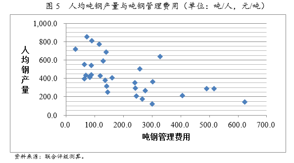 管理費用主要由職工薪酬構(gòu)成,因此,噸鋼管理費用和鋼鐵企業(yè)人均噸鋼產(chǎn)量存在較強的負(fù)相關(guān)關(guān)系。但整體高程度分化,行業(yè)噸鋼管理費用中位數(shù)為141.47元/噸,行業(yè)噸鋼管理費用均值為203.60元/噸;存在噸鋼管理費用異常高的企業(yè)推高了行業(yè)平均水平。噸鋼管理費用處于行業(yè)前五水平的企業(yè)為攀鋼集團有限公司、酒泉鋼鐵(集團)有限責(zé)任公司、重慶鋼鐵股份有限公司、杭州鋼鐵集團公司和太原鋼鐵(集團)有限公司,其噸鋼管理費用分別為650.33元/噸、624.05元/噸、516.39元/噸、503.89元/噸和489.58元/噸。