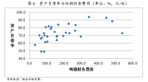 財務(wù)費用中利息支出占大頭,因此,噸鋼財務(wù)費用和鋼鐵企業(yè)的財務(wù)杠桿相關(guān)度較高。全行業(yè)來看,噸鋼財務(wù)費用中位數(shù)為134.2元/噸,平均數(shù)為176.6元/噸,噸鋼財務(wù)費用也存在受異常值推高的問題。噸鋼財務(wù)費用居于行業(yè)前五的企業(yè)分別為,酒泉鋼鐵(集團)有限責(zé)任公司、西寧特殊鋼股份有限公司、重慶鋼鐵股份有限公司、寶鋼集團新疆八一鋼鐵有限公司和太原鋼鐵(集團)有限公司,其噸鋼財務(wù)費用分別為536.26元/噸、478.19元/噸、444.66元/噸、343.60元/噸和296.71元/噸。