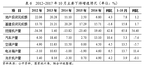 從上文的分析可以看出,原燃料成本是鋼鐵企業(yè)生產(chǎn)成本的重要組成部分,受企業(yè)產(chǎn)品結(jié)構(gòu)、產(chǎn)品質(zhì)量等級、能耗技術(shù)水平等先天條件影響,企業(yè)原燃料成本表現(xiàn)差異較大,成本絕對數(shù)值的高低不一定是企業(yè)成本控制力的絕對對應(yīng),但原燃料成本表現(xiàn)仍有一定規(guī)律可循,一方面,企業(yè)區(qū)位通過影響鐵礦石運輸成本進而影響企業(yè)原燃料成本,另一方面,在國際鐵礦石價格低迷的背景下鐵礦石自給率優(yōu)勢逐漸喪失,而人員負(fù)擔(dān)、生產(chǎn)效率和折舊等亦對企業(yè)制造成本產(chǎn)生影響。而不同企業(yè)的區(qū)位、管理水平和債務(wù)規(guī)模差異又成為影響其期間費用的主要因素。 五 需求、成本和盈利展望 1、需求展望 2017年1~10月,基礎(chǔ)設(shè)施建設(shè),國內(nèi)固定資產(chǎn)投資完成額增速有所放緩,但規(guī)模仍然很大。從上市公司數(shù)據(jù)來看,2017年1~10月,從事基礎(chǔ)設(shè)施建設(shè)的企業(yè)新承接訂單較上年同期顯著增長,且增幅較上年同期顯著提升。加之,地方政府對基建投資有較高熱情,基建投資規(guī)模和用鋼需求將對鋼材銷售提供良好支撐。房地產(chǎn)層面,受“930”政策調(diào)控影響,房地產(chǎn)產(chǎn)業(yè)一定程度上體現(xiàn)出地產(chǎn)行業(yè)囤地意愿較強而開工意愿相對遜色的行業(yè)發(fā)展窘境。不過,購地量的提升為長期內(nèi)建筑用鋼需求提供了較好的支撐。汽車行業(yè)由于前期消費透支等因素影響,2017年,國內(nèi)汽車市場需求不足。目前,國內(nèi)汽車庫存數(shù)量較高,“金九銀十”和年底傳統(tǒng)旺季或?qū)齑嫦a(chǎn)生一定積極影響;但預(yù)期2017年12月國內(nèi)汽車產(chǎn)量仍將保持較低增速或短期下降,一定程度上對板材產(chǎn)品的銷售形成一定沖擊。此外,白色家電行業(yè)受2016年地產(chǎn)市場旺盛影響需求顯著上行。中國仍為全球鋼材第一出口國,但出口消耗國內(nèi)過剩鋼材產(chǎn)量的邏輯得到明顯修復(fù)。出口區(qū)域多為東南亞新興經(jīng)濟體,發(fā)展迅速,用鋼需求較大結(jié)構(gòu)以低端為主;因此,東南亞經(jīng)濟體的穩(wěn)定發(fā)展仍將成為國內(nèi)鋼材消化的重要支撐。