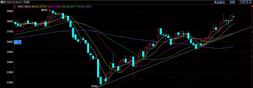 期螺主力RB1810近日已上漲至3800上方,距離前期3912的高點為時不遠,考慮到近兩周累計漲幅已達300點,本就有一定技術性回調需要,期螺在3900附近必定會遭遇較強阻力。但從長期行情看來看,期螺整體仍處于上升態(tài)勢,短期的階段性回調對整體行情并無阻礙,因此可以預計后期期螺行情在經(jīng)歷一段回落后7月或仍以震蕩上行態(tài)勢為主。